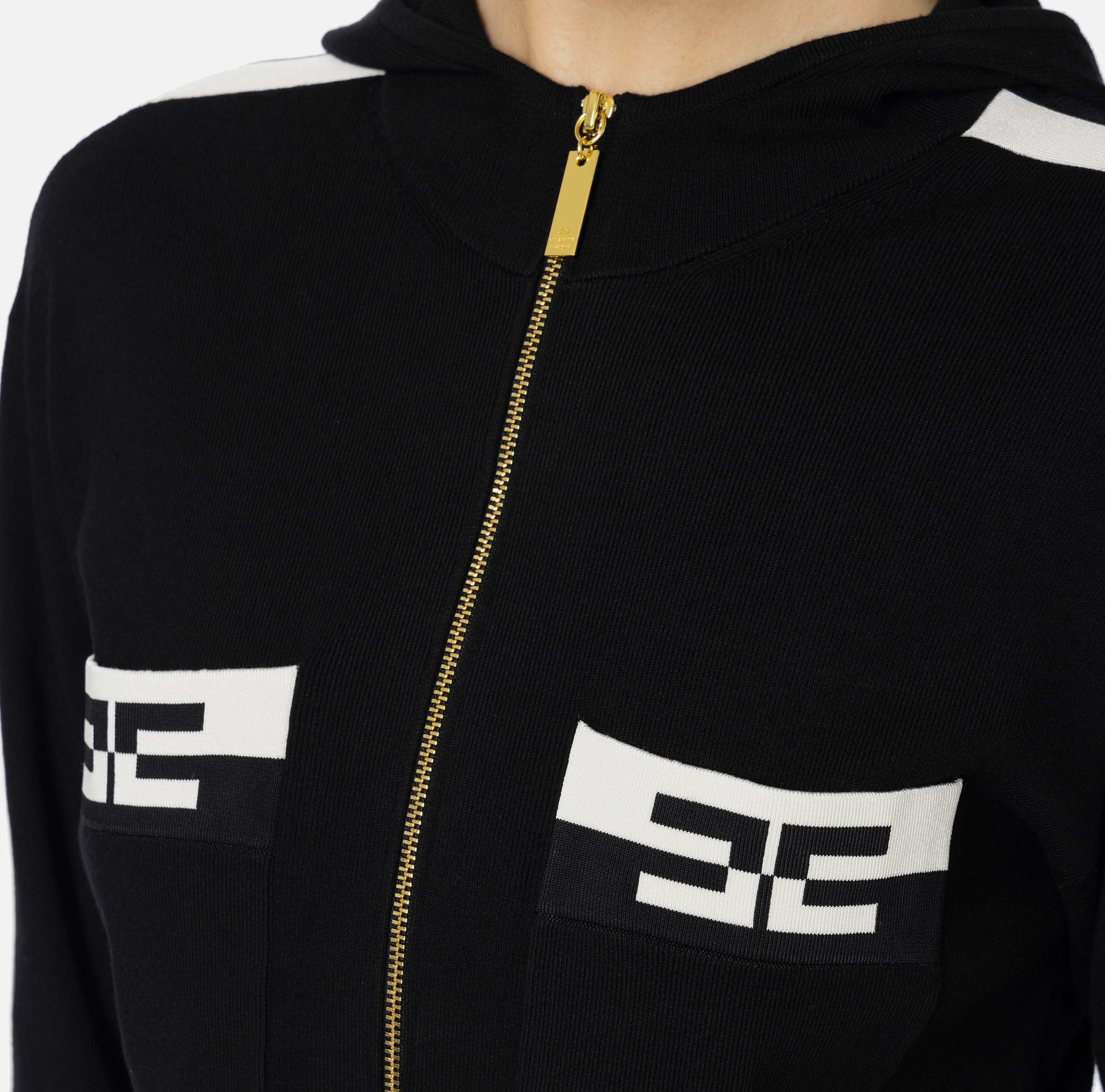 Felpa cropped in viscosa opaca con cappuccio, apertura centrale con zip in metallo dorato e fascione elasticizzato. È caratterizzata da bande bicolor con logo in contrasto colore sulle spalle e sulle tasche.
