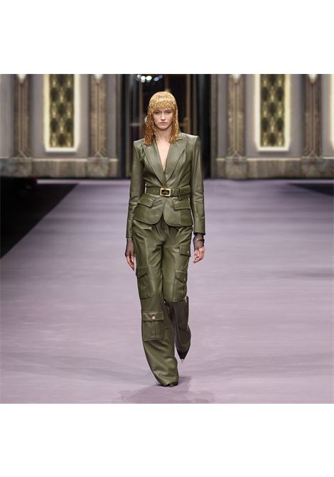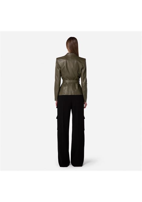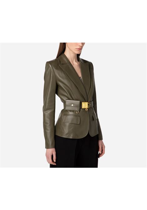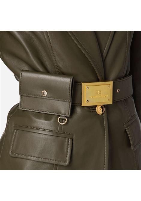 Blazer in pelle con tasche con patte. Il punto vita è enfatizzato da una cintura dello stesso tessuto con fibbia a cassetta logata in metallo dorato e borsellino amovibile