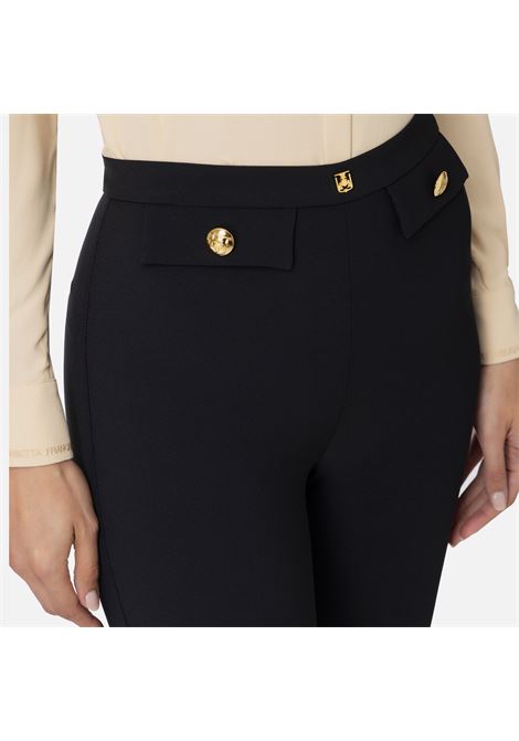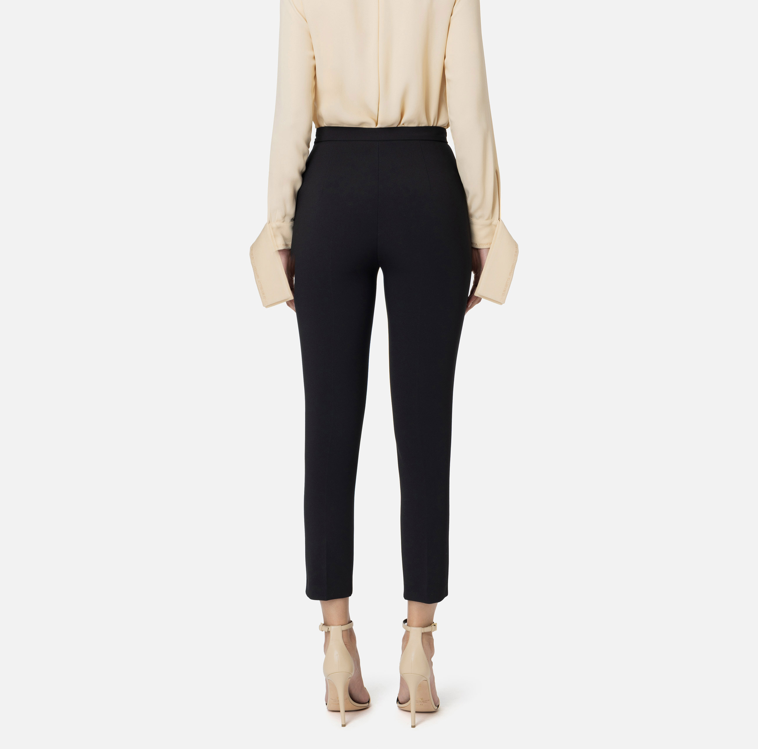 Pantalone dritto alla caviglia in doppio crêpe stretch. È caratterizzato da fascione impreziosito da rivetto logo e tasche con patte rifinite da bottoni in metallo dorato.